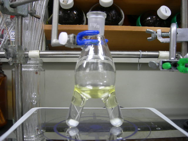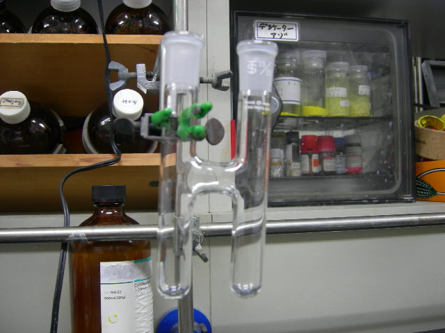 たまには... 最近,遊んだ話ばっかりだったので,たまには研究室の中を...(笑)マスター小村さんことこむーちょは,液膜移送を行っています移送を行う道具で,今まではU字管やH字管を使っていました.これがU字管これがH字管しかし,これらでは,撹拌があまりよろしくないのではないかと...そこで,彼(?)はやってきましたででーーーーーーーん足付きナスフラスコーーーーーースターラーバーも4つ回ってます新しい器具,見た事ない器具はおもしろいですねこの足付きナスフラスコでいい結果が出ることを期待しつつ,実験に励む毎日ですいっちー PR
