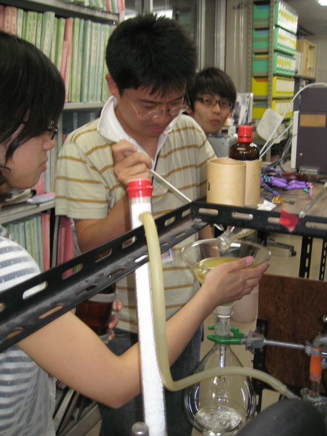 チャージ中 ('08.07.02.) ちょっと見にくいんですが写真の2人、何中だと思います?シリカを詰めた大きなロート下には2Lのナスフラスコ何と何と!アスピで吸引しながらのド大量カラム!!今まさにチャージ中!の図でっす!!!何か後ろに変な人も写ってますが…(笑)ド大量のカラムは本当に大変そうなんですが今回のもかなりてんてこまいな共同作業に仕上がっていました。でもきっと、普通にやるより早く終わったはずなのでよかったです。 PR
