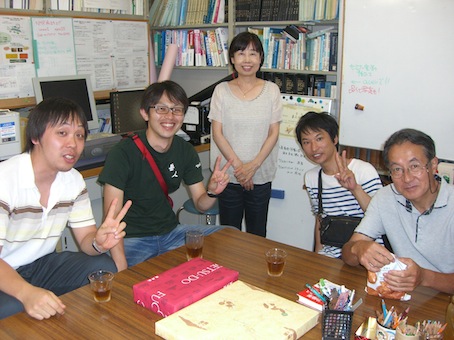 卒業生襲来!(2015.7.1) 今日は梅雨の晴れ間.徳島のお昼は晴天&めっちゃ暑っ!!昨日びっくりするわ.卒業生が事前連絡なしに,ただいまって急襲してきました!! このお三人! 西村さん,外野さん,山本さん角田先生も堀川さん目を真ん丸にしてびっくり! そりゃそうや.さらに驚くことには,外野&山本コンビと部長さんは全くの偶然らしく,大学の駐車場でばったりあったそうな.んなことある??このあと,このお三方は角田先生の畑に行って野菜をゲット! 今は「枝豆」!ということで,枝豆パーティ!! こういう日にいる学部生って,ホントに鼻が利くよね! そういうの大事だよね.ごちそうさまでした!そして,また帰ってきてくださいね!