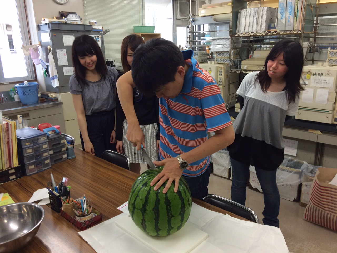 巨大スイカ&谷ちゃん(2015.7.11) おととい,3年生の泓くんが巨大スイカをもってきてくれました.あまりに大きすぎて,冷蔵庫に入らなかったので,クーラーボックスの中に氷水を入れて冷やしました.そして本日,「スイカ割りっ!」です.そとで,こん棒もってやろうかとも思ったのですが,食べる方を優先.研究室で包丁片手にわることに. 相当でかい! ホント立派なスイカです! 重さは14キロ!!切るのには苦労しましたが,なんとか仕上げました. きれいな赤い実が!非常に甘くておいしいスイカでした.と,夕方4時過ぎ,角田研14期生 谷ちゃん登場!わざわざ,香川からお中元をもってきてくれました.ありがたい!(まあ,昨日徳島で飲み会だったから来てたらしいですが) たくさんのビールありがとうございます! 研究室旅行で飲みますね.
