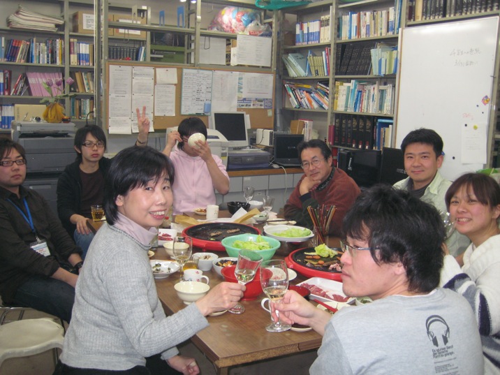 焼き肉Party! ('09.03.12.) 先日研究室にて焼き肉パーティーをしました!写真の一番手前では何気に「ルネッサ〜ンス!」やってます(笑)みんなでモリモリ食べてあっという間にお肉はなくなってしまいました。とてもおいしかったです♪♪♪ただ数日間セミナー室には焼き肉臭が漂っていました。。