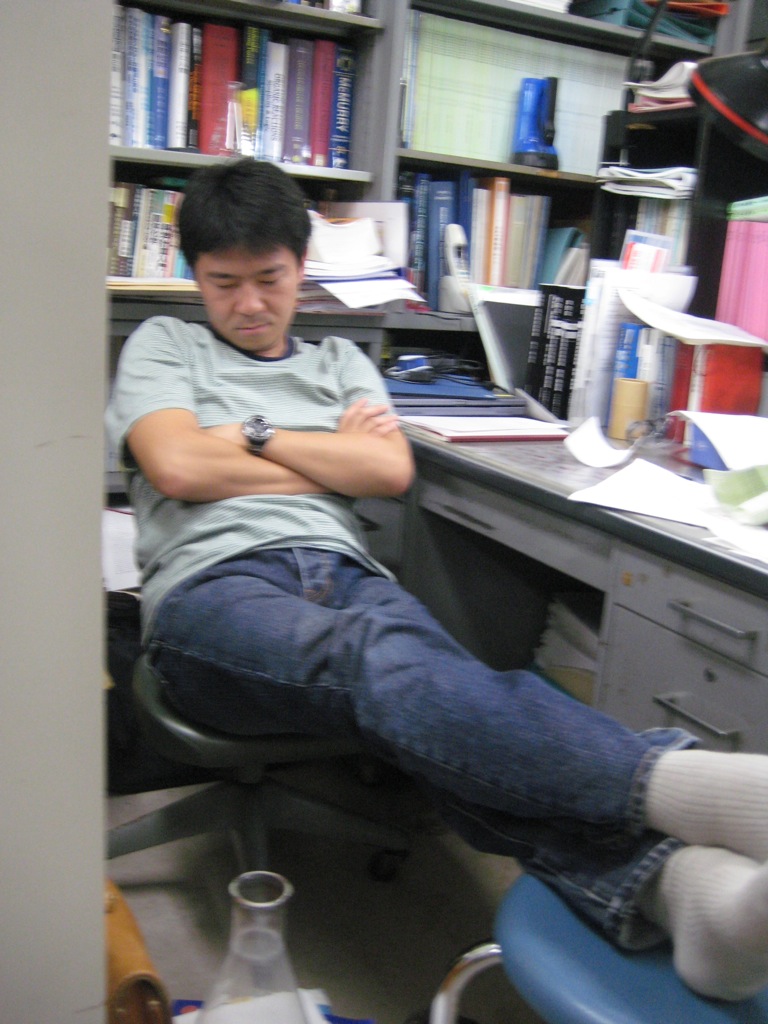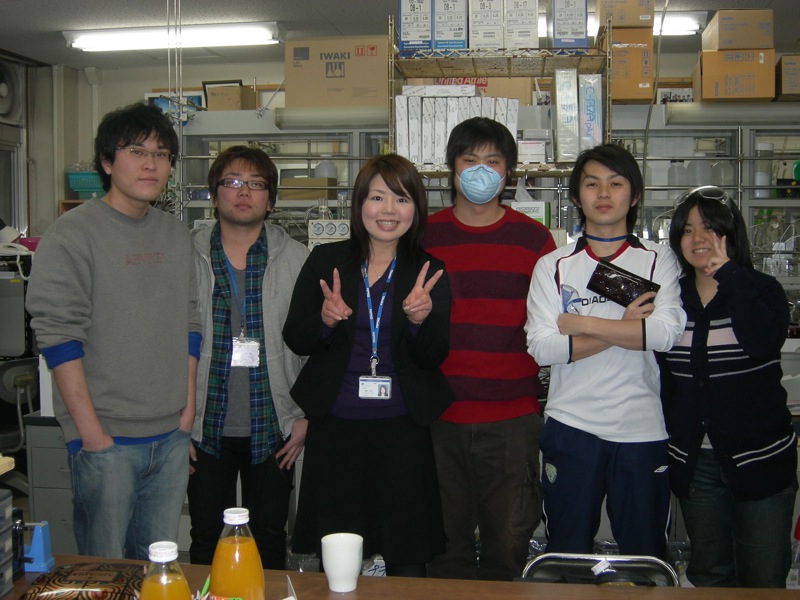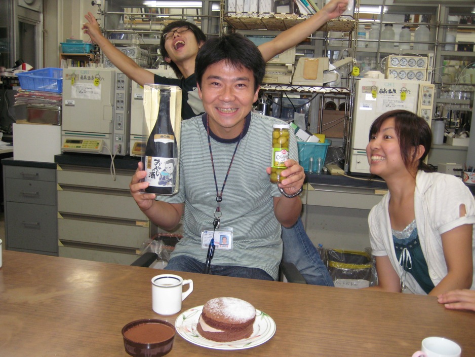 真夜中にHAPPY BIRTHDAY!!! ('08/08/31) お久しぶりです!最近全く更新できなくてすいません。忙しくしている間に研究室旅行まで終わってしまいました。。研究室旅行についてはまた今度!ということで暫しお待ちを…何故最近忙しいかと言いますとそうです!卒論発表がもうすぐそこまで近づいているんです!!ついに昨日で一週間を切ってしまいました。そんな大忙しな毎日ですが今日は忘れてはいけません加来さんのバースデイなのです☆と言う事で深夜に残っているメンバーでささやかですがお祝いをいたしました。何か周りにおかしな人が写り込んでいるのは気にしないで下さい(笑)↓↓ちなみに数時間前の加来さんです(^^;)やはり卒論直前でお疲れの模様。本当に発表まで後少し4年生も連日遅くまで実験頑張っています!是非卒業生の皆さんも応援宜しくお願いします☆