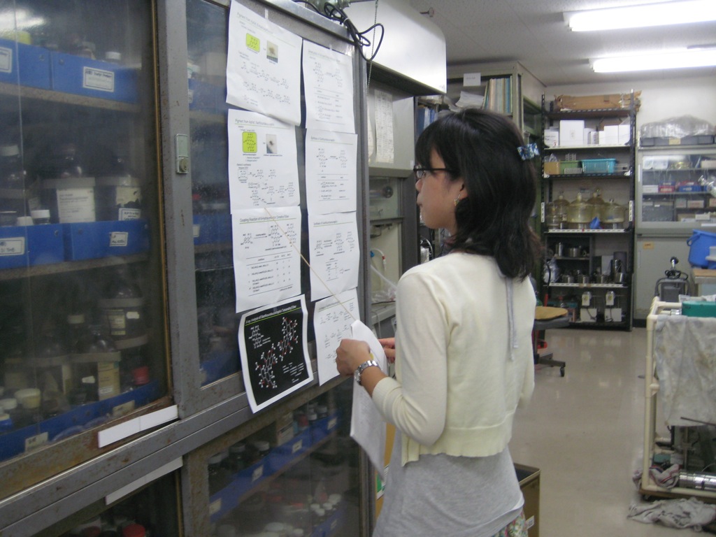 卒論前夜 ('08.09.05.) 明日は遂に卒論発表の日です!今4年生は壁などに貼ったスライドを前にひたすら原稿を覚えています。実験もギリギリまでみんな頑張りました。明日は頑張った成果を思いっきり発表してくるだけです!!明日の夜にはおいしいお酒が飲めている事でしょうvそのために今はマスターの邪魔にも負けず練習するのみです(笑)