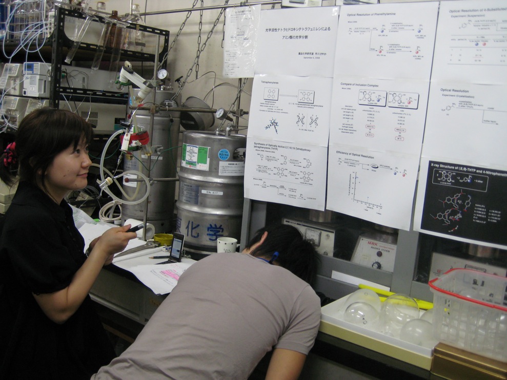 チャージ中 ('08.07.02.) ちょっと見にくいんですが写真の2人、何中だと思います?シリカを詰めた大きなロート下には2Lのナスフラスコ何と何と!アスピで吸引しながらのド大量カラム!!今まさにチャージ中!の図でっす!!!何か後ろに変な人も写ってますが…(笑)ド大量のカラムは本当に大変そうなんですが今回のもかなりてんてこまいな共同作業に仕上がっていました。でもきっと、普通にやるより早く終わったはずなのでよかったです。