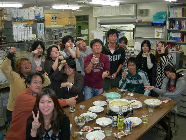 新4年生配属! 4月9日に新しく新4年生が7人、品化にやってきました!!男の子2人、女の子5人と女の子が多いです。そして9日に歓迎会を行いました!料理のメニューはいつもより豪華(by加来さん)だったみたいです。☆メニュー☆とりチリ、刺身、トマト&オニオンサラダ、きのこたっぷり炊き込みご飯大根とイカの煮物、キャベツと鶏肉のスープキャベツと豚肉のゴマだれ和え、いわしの梅肉和えキャベツはなんと角田先生宅から取れたキャベツをいただきました!私達が一生懸命作った料理は新4年生に好評でした今回、とりチリは男の手料理っていうことで、M1男2人だけで作っていました。写真はM1の2人と加来先生です。普段料理をしない2人ですが、とりチリの出来栄えは素晴らしかったです新4年生が入ってきたので、品化もにぎやかになりました!これからもがんばっていきましょうお遊び担当いっちー