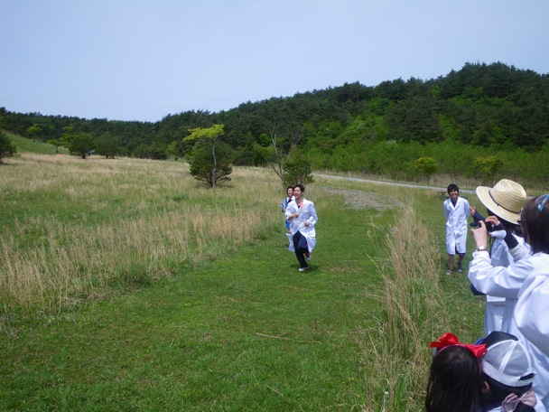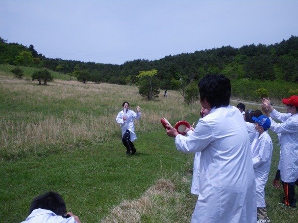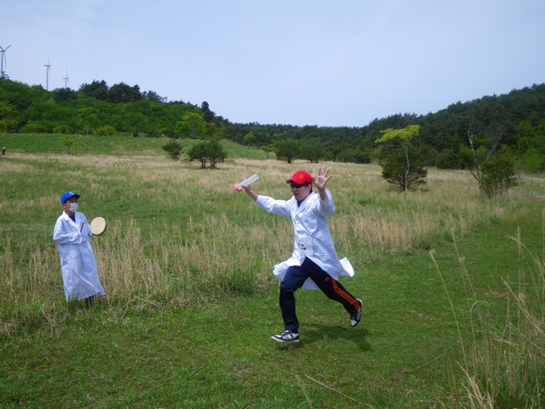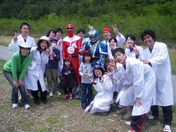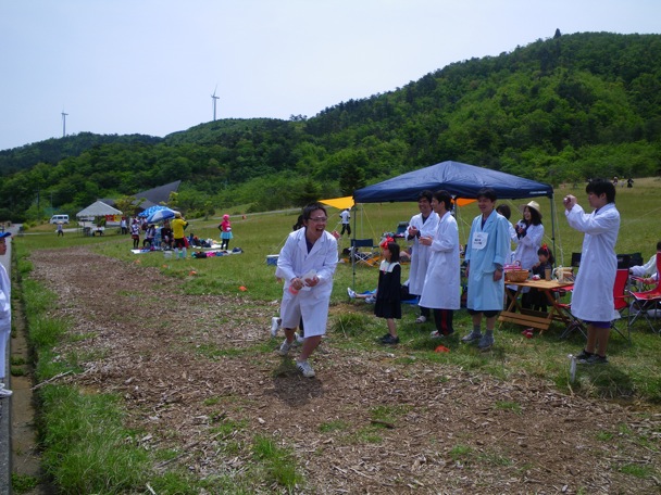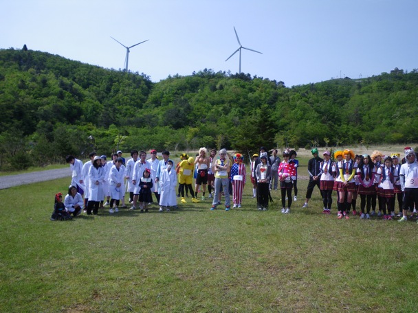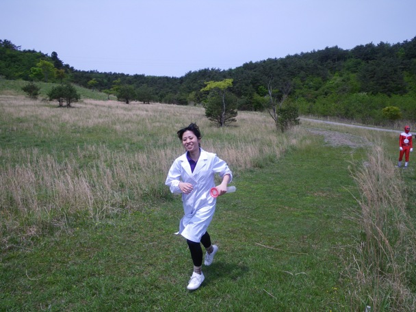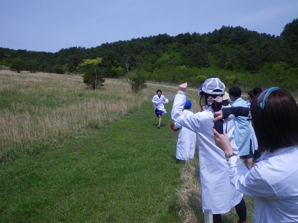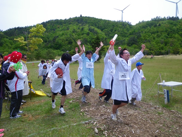 大川原高原クロカン仮装リレーカーニバル2012(2012.5.13)その1 タイトル見て,何それって思った人もいるでしょ?そうだよねぇ.まさか品化のメンツが走らないよね.ふつう...それが,行ってきました! クロスカントリーコース.しかも,仮装付き!開会式の様子はこんな感じです.うちは全員,白衣を着ての参加です. (他のチームの仮装の本気度が違う.....)今回エントリーしたのは,「ファンラン部門」2時間の間で1,333mのコースをリレーで何周できるか?を競うものです.さあ緊張のスタート,廻りはみんな本気で走ってる感じの人ばかり.我々はノー練習できちゃいました.別にバカにはしていません.あくまで真剣に走るつもりです.第一走者は,今井くんスタートを待ってます. パン!スタートの合図とともに一斉に飛び出しましたが,ナント今井くんトップです(笑).ノー練習でそんな無茶な!!という私たちをよそに,ぐんぐんとばします. (コースっていったって,完全に野原.しかもアップダウンが,ぱねぇです)一周を終えて帰ってきたとき,二位でかどちゃんにバトンタッチ!(はやっ)かどちゃんも速い速い.二位のままで,三番走者おぐりんにつなぎます. おぐりんのお次は,インターンシップで実験中の3年生ナベくん.本人談では,「インドアなんす」ってたくせに,めちゃはや.これから「アウトドアなべ」です. 続いてレッドキャップ七條! (今日も決まってます!)