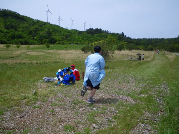 大川原高原クロカン仮装リレーカーニバル2012(2012.5.13)その2 おっとこまえレッドキャップよく頑張った!走り終えたら倒れ込んでました.6番手,アヤネさんにバトンが渡ります! (本来この日は予定があったアヤネさん.ムキになって走ってます!)7番手ドクター部長さん!(なんのこっちゃ)飛び出しは絶好調! でも山の上に上がったらとたんにペースが....く,苦しそう.第8走は,絶対走らなさそうな,さらちゃん.自分から立候補して来ました. (余裕の表情のさらちゃん.頑張ってます)9名エントリーの9番目は,ナ,ナ,ナント...KK自らの出走です(だれや,よしときゃ良いのにってゆったやつ). (飛び出しはよかったのに,体力なし!徐々にペースダウン) (傍らには,ご当地ヒーロー ”マヴェル” さんの姿も)走り終えた私は,約15分ほど口がきけない状態に...倒れ込んでしまいました. ここまで,一周7分半のペースです.9名なので,ここから今井くんに戻って二周目です!