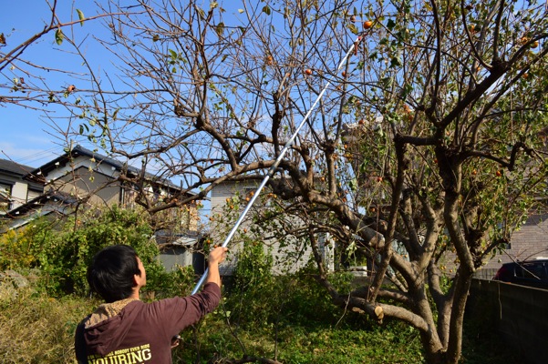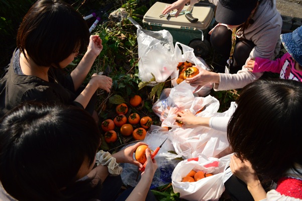 柿もぎ 本日は土曜日.普段,病院や薬局に実習に行っている5年生たちが実験をしに戻ってくる日.他の研究室や薬学部はどうなのか分かりませんが,品化の5年生は実験を進めるために頑張って来てくれています.ですが...今日は元の事務職員の方から「柿がいっぱいなっているから取りにおいで」とのことで,みんなで柿もぎに出掛けました!!お昼を公園ですがすがしく食べた後,早速現地へ(といっても大学から,歩いて25分くらい).結構大きな柿の木が3本.「これ全部とっていいよ」って...まずは,高枝切りばさみの使い方を教わって,枝ごと片っ端から柿をとっていきます. (復活のナベくんの初仕事??)女性陣は,とってきた枝付きの柿からはさみで枝を落としていきます. (結構綺麗な柿が,女性陣頑張ってます!)高枝切りばさみが思いのほか重くて,さらに間違って太めの枝をターゲットにすると,切れない...悪戦苦闘です.ついには木に登って,はさみを入れ出しましたが,先の方の柿は届きません.最終的には木登りして,のこぎりで太い枝ごと切り落としたりします(都会っこのKKには無茶なと思いつつ,ノリノリ)3本の木は瞬く間にはげ散らかしたことに.いったい,いくつとれたのでしょう? 全部持って帰って良いよとのことでしたが,ゆうに2〜300はあるでしょう.「そっちにすだちの木もあるから積んで帰って」と.すだちもゲットだぜ!研究室に持ち帰ったみんなは,早速どうやって食べるかの検討に入りました.ジャム?カクテル?デザート? たのしみぃ本日の参加者は,堀川さん,部長さん,さらちゃん,ゆかりん,マーキー,はるちゃん,なべくんとKK(ふみなみちっぴも)楽しい一日でした.ありがとうございました!
