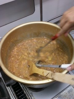 柿もぎ その後 土曜日,大量にもいできた「柿」今日はジャムづくりに挑戦です!朝から,堀川さんが大量の柿の皮むきと種取をしてくれました.レシピに従って,砂糖とブランデーを加えて,煮詰めていきます.最初は芋のごった煮か?と思える形態でしたが,徐々にジャムっぽく.かわりばんこに混ぜて煮詰めていきます. (このコンビも) 最終的には,ほんのり甘い香りのする,素敵なジャムができました.