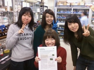 卒業生が帰って来たよん!(2016.2.20) 本日は京都から,おぐりん! 研究室の女子ーズたちと!そういえば,おぐりんの論文別刷りがまだきてない?ということで,急いでプリントアウト.今日は実家で論文を肴に,一杯かな?お土産もいっぱい.ありがとう!6年のナベちゃん,あさこ,かとーもあえて喜んでました(写真忘れた,ゴメン)1月に入ってからもすごい勢いで,卒業生が帰って来てくれてますねぇ.何と今年度(平成27年度)は,のべ39名の帰品化数です.最近,音沙汰のないあなた! どう?「ただいま〜〜〜〜!!」って,帰ってこない?