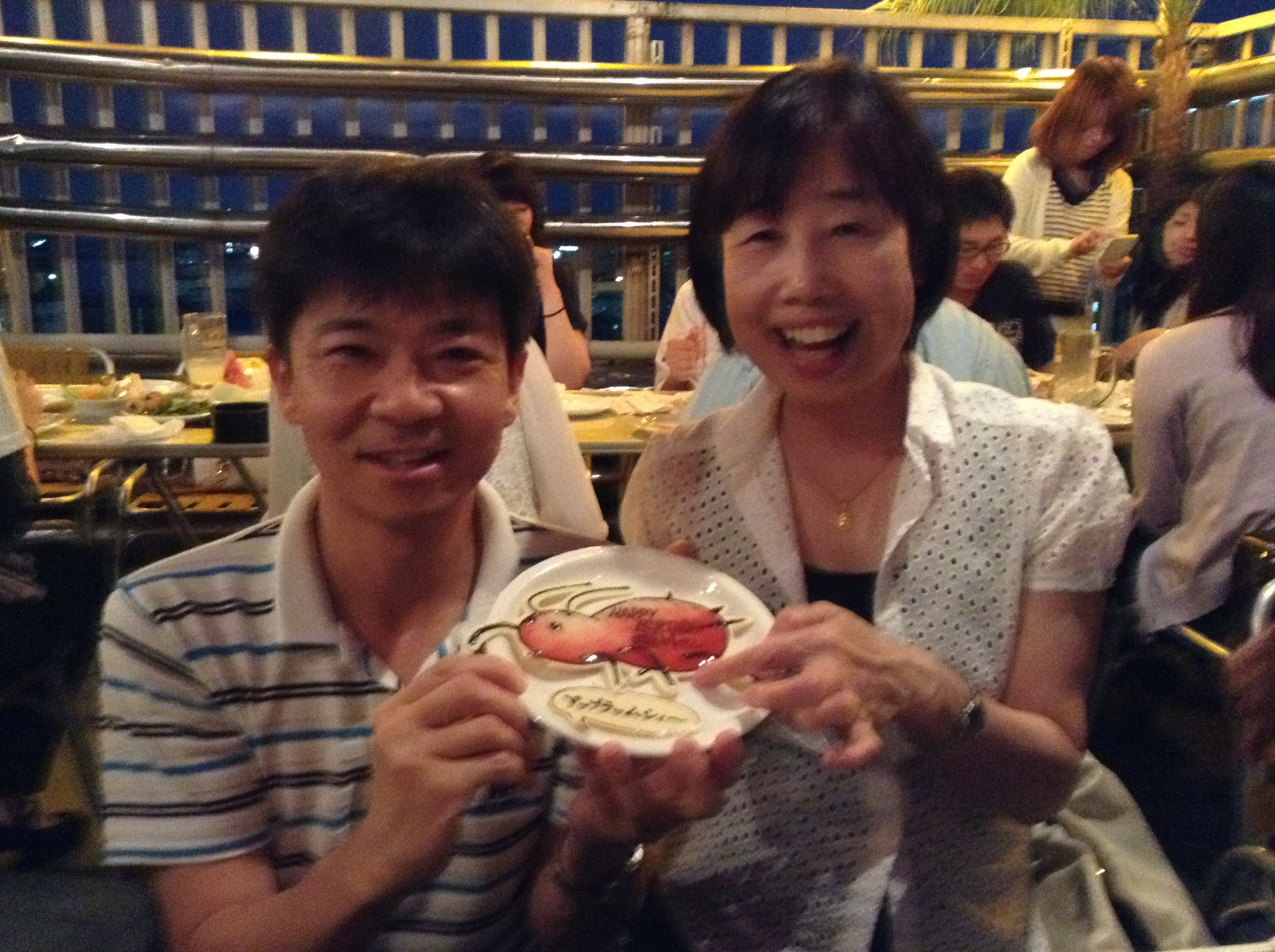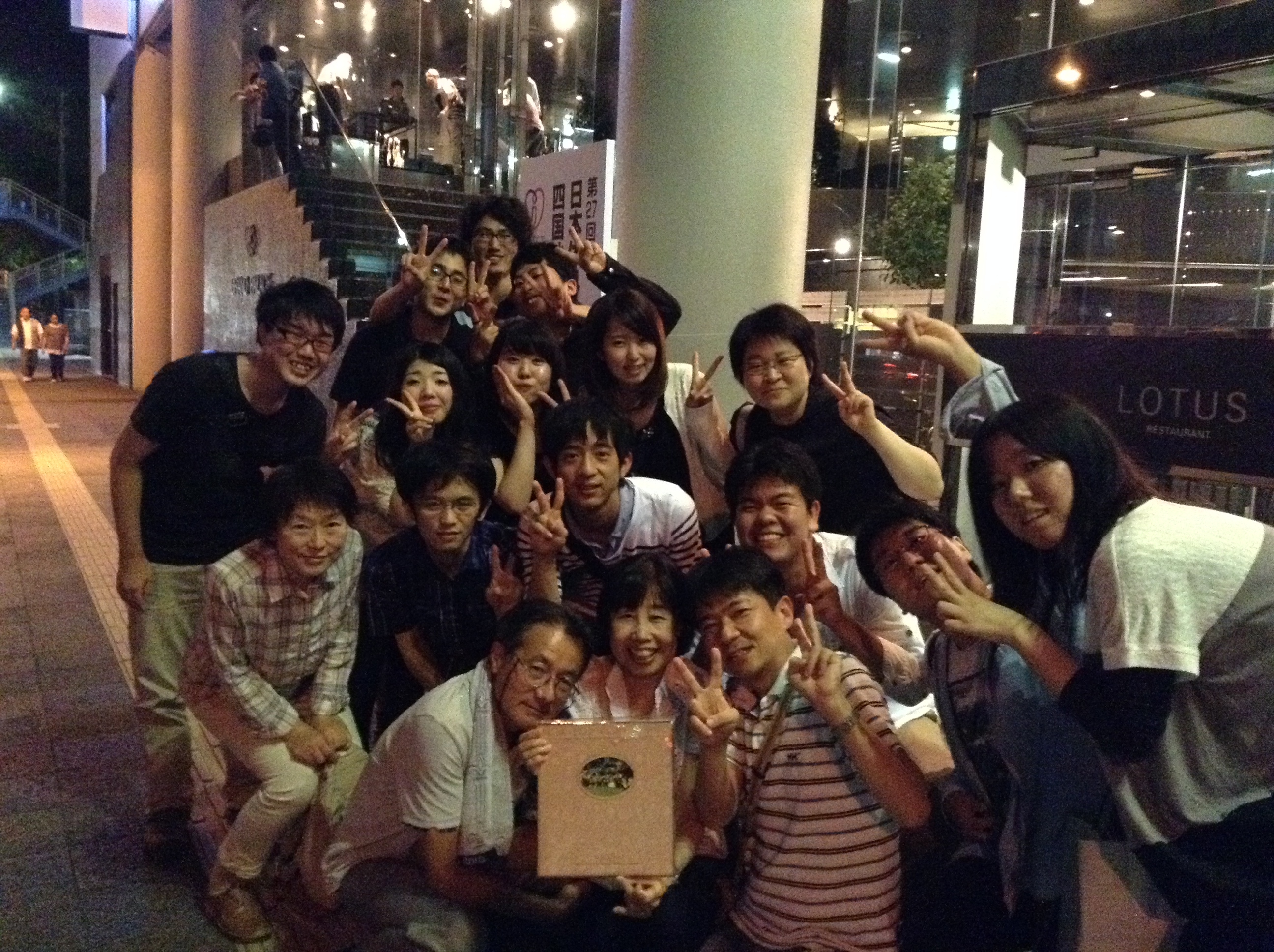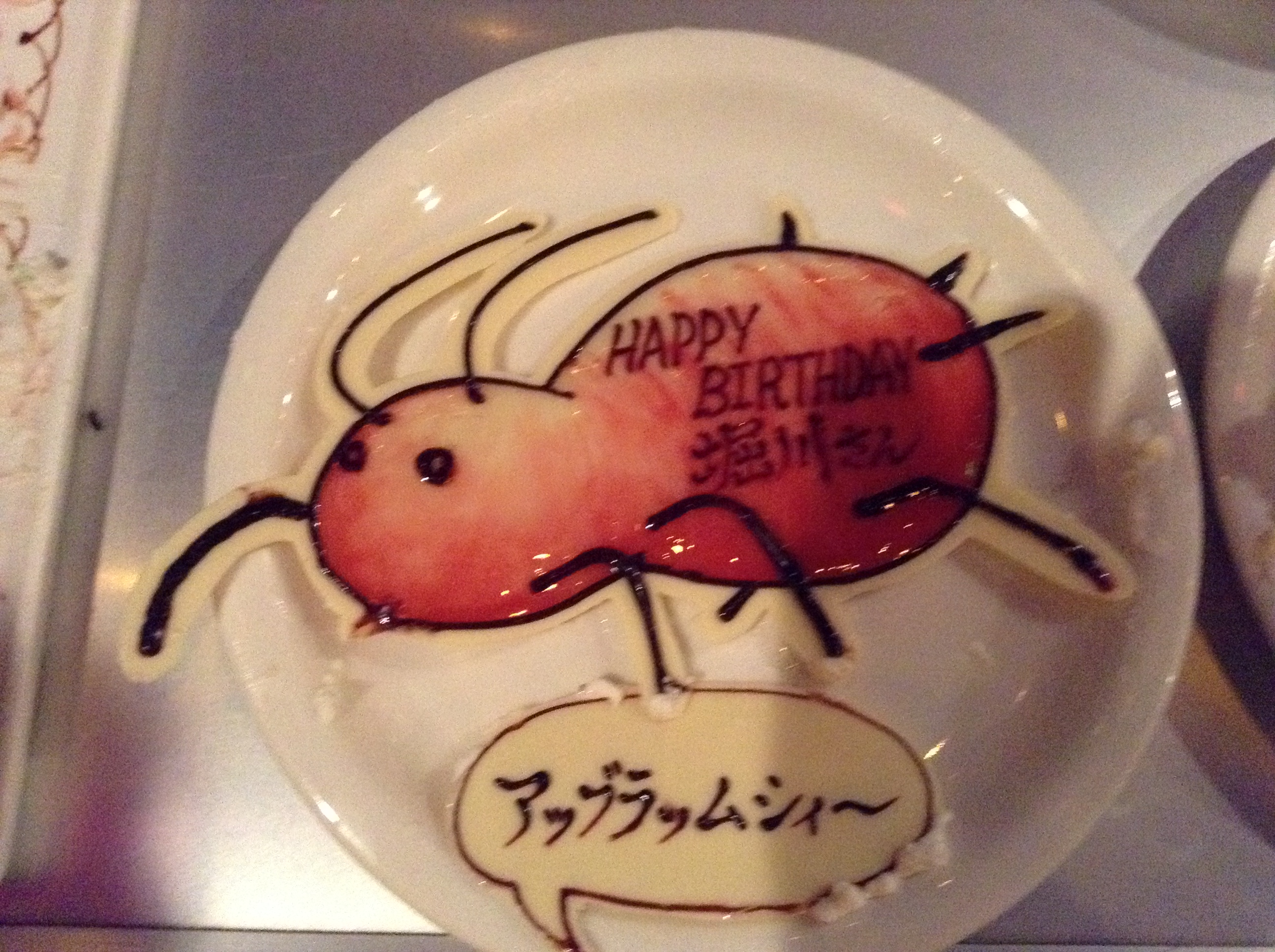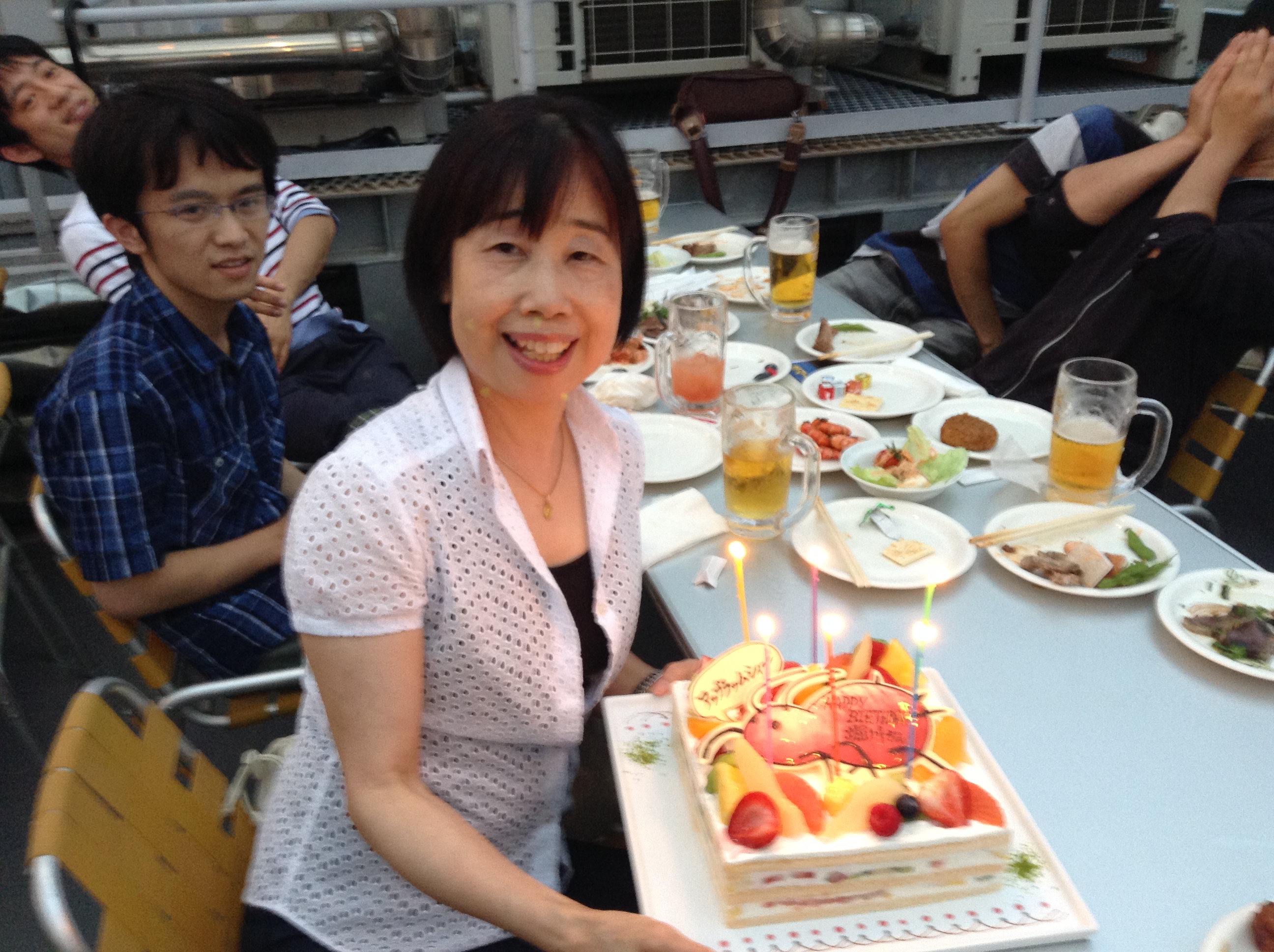 からの・・・ 堀川さんサプライズ大誕生会!!(2015.7.3) 7月5日は堀川さんの誕生日!! 毎年は研究室でケーキとなりますが,今年は特別な誕生日だから!! 「サプライズ 大誕生会」フルーツいっぱいケーキを持ち込み(もちろん許可は得てます),大合唱!! ビアガーデンの他のお客さんがいるのも気にしない!! ケーとともにぱちりっ!ケーキの図柄みたい? 似顔絵案も出たけどやっぱりこの図にしました. 二年前の卒業生 マキちゃんの書いてくれた セイタカアワダチソウヒゲナガアブラムシ カワイコちゃんバージョンこのあと,研究室からの「メッセージ入り色紙」のプレゼント! 卒業生から届いていたプレゼントを手渡して,KKが温めていた企画「卒業生からのおめでとうコメントアルバム」約10日前に一斉メール送信して,参加を呼びかけたところ,70通を超えるコメントが届きました!! やるじゃん卒業生!それを「真っ赤なアルバム」に貼付けて堀川さんへ渡しました! こんな感じ! (手に持ってるものは気にしない!まあね)たいそう喜んでいただけました! 参加してくれたみんな,本当にありがとう!この日をともに祝えて,会を盛り上げてくれた現役生ありがとう!!角田先生&奥様,お越しいただきありがとうございました!! いいねぇ.品化.月曜からは二周目! 堀川さんいつまでもみんなの姉さんでいてくださいませ!