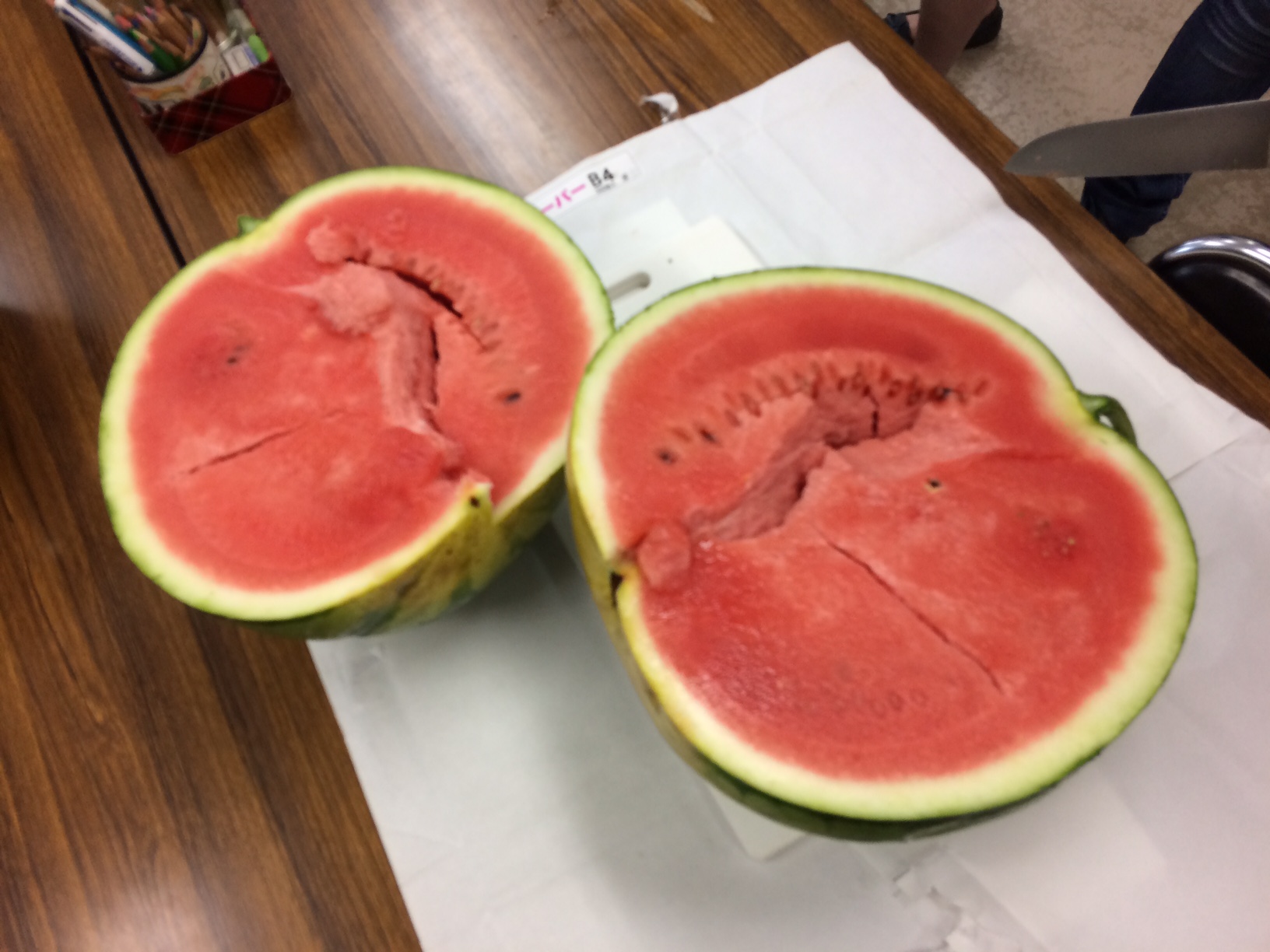 巨大スイカ&谷ちゃん(2015.7.11) おととい,3年生の泓くんが巨大スイカをもってきてくれました.あまりに大きすぎて,冷蔵庫に入らなかったので,クーラーボックスの中に氷水を入れて冷やしました.そして本日,「スイカ割りっ!」です.そとで,こん棒もってやろうかとも思ったのですが,食べる方を優先.研究室で包丁片手にわることに. 相当でかい! ホント立派なスイカです! 重さは14キロ!!切るのには苦労しましたが,なんとか仕上げました. きれいな赤い実が!非常に甘くておいしいスイカでした.と,夕方4時過ぎ,角田研14期生 谷ちゃん登場!わざわざ,香川からお中元をもってきてくれました.ありがたい!(まあ,昨日徳島で飲み会だったから来てたらしいですが) たくさんのビールありがとうございます! 研究室旅行で飲みますね.