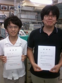 薬物乱用防止指導員に委嘱されました!(2014.7.16) いやぁな,ニュースが多い昨今.近頃は,脱法(違法?)ドラッグがらみのニュースが絶えません.薬学に身を置くわれわれは,クスリのいい面と怖い面を広く,啓発していく役目を担っています.もちろん,卒業生の皆さんも日々のお仕事の中で,様々な取り組みをしていることと思います.今回,当研究室に所属する二名の4年生が,徳島県知事より『薬物乱用防止指導員』として委嘱されました. 菱田くんと梅井くん 啓発活動頑張ってください!!