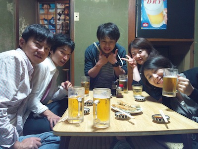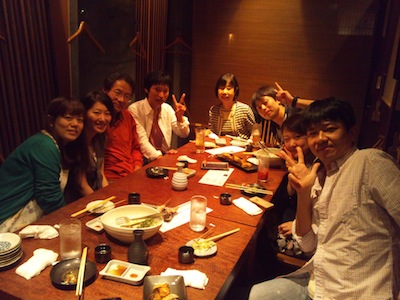 卒業生が帰ってきました!! 前のエントリーの続きです!!18日(金)は,清水さんが夕方に帰研.新3年生男子群とナベくんと歓談.仕事終わりで,下河辺さんが秋田町集合! お二人とも,角田研11期生.全くお変わりなく,元気はつらつ!まいりました...19日(土)の朝には,上のお二人と,市川さん(13期生),谷さん(14期生)が研究室に顔を出してくれました. あいにく,品化はこの日お休みにしていたので,ここでは,角田先生とKKしかお話しできませんでした.ん〜〜.残念! また学部生がいるときに帰ってきてね・・・19日の19時からは,外野くんと山本くん(11期生)が,神戸・明石から駆けつけてくれました. 谷ちゃんは,都合でかえっちゃったんですが,みんなでプチ同窓会となりました. 集合写真!!社会人になったみんな,それぞれ活躍しているようで,角田先生,堀川さんともども楽しくお酒をいただきました.何次会まで行ったんだろう???最後は,なつかし「ぎょうざ屋」の二階でぱちり. 西丼みてる?いろんな話が聞けてとてもリフレッシュ! KKもまたがんばるぞっと力をもらいました!!またかえってきてね.