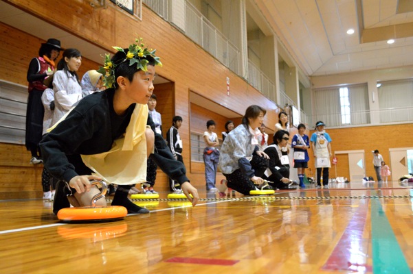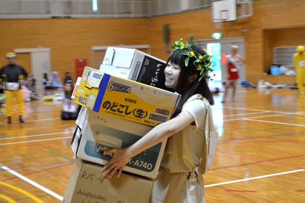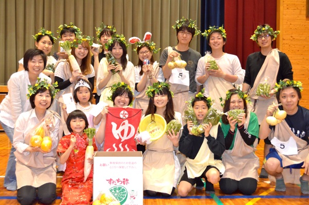 2013大川原高原仮装クロカンリレー大会 → 交流会 今年も行ってきました!「2013大川原高原仮装クロカンリレー大会」 当日はあいにくの雨・・・去年のようにリレーできず... 体育館でゲーム大会&交流会になりました! 全体集合! 今年のテーマは「テルマエ・ロ○エ」 6年生がリーダーになってつくってくれました(まだ,映画見たことないですけど.阿部 △さんでてますよね.あれ). ゲーム大会は,まず「カローリング」,氷上が「カーリング」,床上が「カローリング」. めっちゃ白熱する!! 面白すぎっ! みんな真剣(もちろんどのチームも)本気になっっちゃいました. F也も真剣.結果は無念 はしもっちゃん.いつになく本気. ってゆうか目が血走ってる? 西村さん,今井くんらの100点満点の活躍もあり,上位で終え,次の競技です. 「段ボール運び」 空き段ボールを抱えて,コース一周のあと,リレーします.この時,新たに段ボールを重ねていくんですねぇ.3人目は3個持って移動になるし,10人目は10個抱えていくわけですな.最終的にたくさん持ってる方が得点ゲット! こんな感じ.まきさん持ちにくそう. う〜〜んこの競技はちょっと作戦ミスか? 得点はしょぼ〜ん... 気を取り直して,次の競技! 「みんなでジャンプ! 大縄跳び!!」 懐かしいねぇ.品化チームは選抜10人による全体大縄跳び. この得点の入り方が,ハンパ無い! 今までのすべてのゲーム得点をなき者にするかの,ジャンピングゲーム! 隣のチームは5000点をたたき出してました.品化はそんな中,第二位!!!これは快挙!? 総合得点でも第二位(そらそうか)に入りました. 佐那河内 佐那の里でのお買い物券ゲットだぜ! やったー. さらに,個人賞で今井くんが,「佐那河内でとれた野菜詰め合わせ 段ボール箱一杯分(はみでてるって)」をゲット! さらにさらに,ちっぴーが個人仮装賞をいただきました. 今年はクロスカントリーで走れなかったけど,ホントに楽しい一日でした. 最後に記念写真をパチリ??? あれ?3月に卒業した人にうり二つの人が??