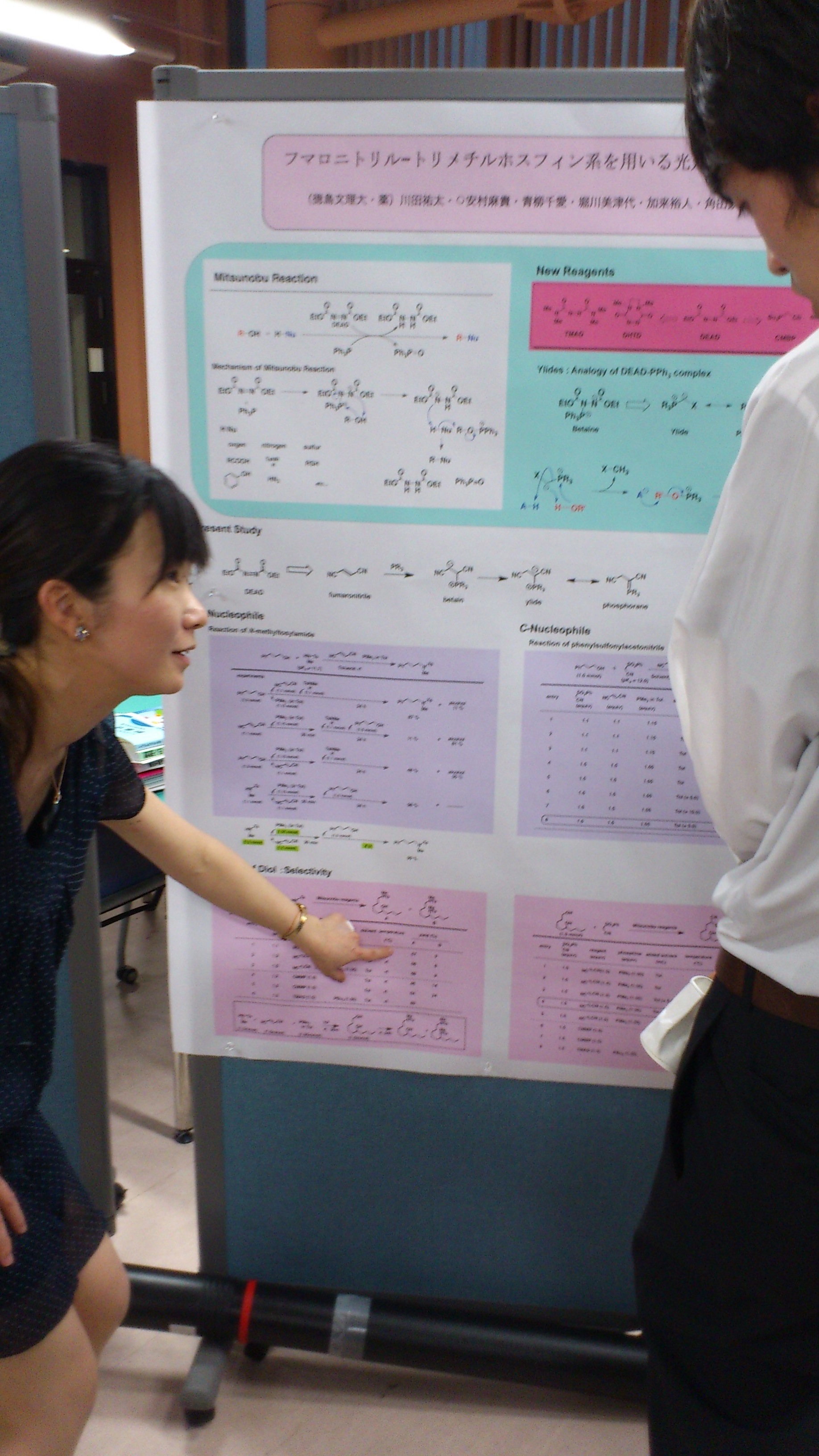 日本薬学会第133年会に参加・発表しました!! 春爛漫! 新年度スタートですね.卒業式のあと,年度末行事『薬学会年会』に参加してきました!演題は三つほど前のエントリーに書きましたが,学会発表デビューの5年生も堂々と発表していました!さて,そんな中 品化関係では卒業生に会いましたよ. 結晶場での分子認識を利用したマイケル付加-脱離反応の初めの実験者『山口 高』さん. 久しぶりに見た彼は,一年前よりやや,ふっくら. 病院勤めの彼.今回は発表できていたとのこと.有機化学の発表ポスターを懐かしんでおりました. もう一人は言わずとしれた,元職員Iさん 弟子のひとり,おぐりんの発表を心配なのか見に来てくれました.ありがとう!今回は,5年生中心の発表でしたが,これから後輩たちも発表できたらいいね!追:学会中は知らなかったんですが,KKの発表は「講演ハイライト」に選出され,報道機関に配られていたみたい.8000件を越える発表のなかから,100件程度選ばれるようで,やったーとニヤニヤしております.