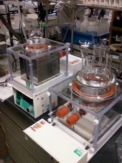 アリールジアゾニウム塩の還元的カップリング反応 最近実験してるのですが,今日のは特に骨が折れました.タイトル通り,芳香族ジアゾニウム塩を還元的にカップリングしました.1.原料を水酸化ナトリウム水溶液に溶かして0℃に冷やします.2.ここに,亜硝酸を加えてから,4M塩酸を滴下していきます(このとき,0〜7℃内で)→A液(褐色〜橙色)3.1リットルの三ツ口フラスコにCuSO4・5H2Oを水にとかして,0℃にします(青色).4.3の水溶液にアンモニア水を加えて,続いてヒドロキシルアミンの水溶液を加えます(ヒドロキシルアミンの水溶液は,用事調製)(濃青色)5.4の液にA液を滴下ろうとから滴下していきます(このとき,0〜8℃内で).(茶褐色?)6.滴下し終わったら,続いて30分加熱還流です.7.室温に戻して12M塩酸を滴下して加えます.8.後は室温で12時間ほど撹拌書くだけで,どっと疲れたぁ.操作「2」と「5」に時間がとられて,おわんない.そう今は,操作「6」の途中.赤(紫)くなってます.室温にさめるまで,どのくらいかかるだろう.滴下には? と考えると,涙涙です. つづきはこちら