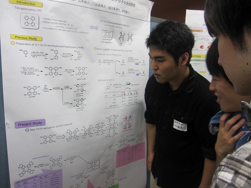 MCASIA & 有機分子構築法夏の学校 参加しました 先週,KKは初めて学会&勉強会のハシゴをしました.①Molecular Chirality ASIA2012(福岡)②有機分子構築法夏の学校(蔵王) です.つまり,徳島→福岡(ポスター発表)→仙台→蔵王(口頭発表)→仙台→伊丹→神戸→徳島....いやぁ,横断ですね.①MCASIA2012では,「An Efficient Method for Preparation of Optically Active 2,3- and 2,5-Disubstituted Cyclohexanones under Asymmetric Inclusion Complexation」 邦題:不斉分子認識を基盤とする光学活性2,3-及び2,5-ジ置換環状ケトン類の効率的供給法 というタイトルでポスター発表してきました. 一日目の発表でした.多くの方に研究成果を見ていただき,多数ご質問,ご助言等いただきました.ありがとうございました. 福岡では,こちらの卒業生と会食もしました. 二日目終了後には,仙台に立ちました. 仙台で一泊した後は,②有機分子構築法夏の学校にて,口頭発表させていただく機会を得ました. 蔵王まで一時間バスにゆられて到着です. 北は北海道大学から南は九州大学までの全国の教授の先生から助教の方まで,ワイドレンジな先生方との一泊二日,有機化学の会でした. 熱い発表と討論は,昼2時からはじまり,夕食を挟んで9時半まで行われました.懇親会は10時半からはじまり,翌3時くらいまで,話し込んでしまいました. 二日目も朝9時から発表がありました. KKの番は最後から二番目のお昼前にまわってきました. 「熱力学支配下,分子認識利用した不斉合成法の開発」というタイトルにしました.デラセミ化からジアステレオマー制御,マイケル付加-脱離による光学活性ケトンの調製まで8分間でまとめるスライドにしました. ものすごく緊張してしまいましたが,予定時間ちょうどに発表を終えました. 質問やコメントをたくさん戴き,持ち時間いっぱいまで(少しオーバー気味)話を聞いていただけました.ありがとうございました. 昼食後仙台まで戻り解散となりましたが,たくさん勉強させていただいた二日間でした. 水曜の昼出発から,日曜日の夜10時過ぎに帰宅と相成りました. KK,今週は完全にへばってます..(涙)