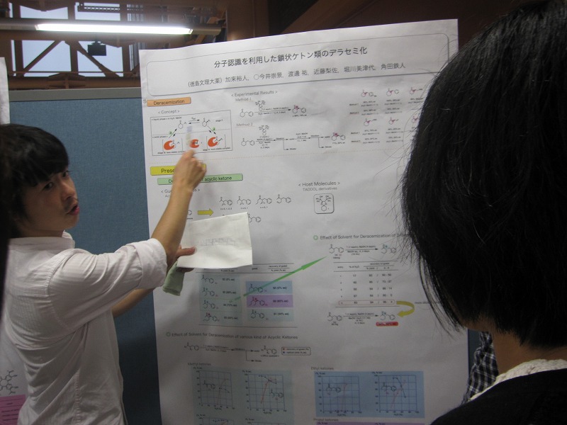 プロセス化学東四国フォーラムセミナー ポスター発表 更新が遅れました!去る6月16日,徳島大学にて「第8回プロセス化学東四国フォーラムセミナー」が行われました.本セミナーでは,品化は毎回欠かさず出席しています.学生さんには企業の方の話が聞ける良い機会ですし,良い刺激になっているのではないでしょうか?いつもは講演を聴きに行くという感じでしたが,今回は初の試みとして学生さんのポスター発表が組み込まれました.品化からは,6年生の比嘉くんと5年生の今井くんがエントリーしました! 徳島にいながら多くの先生方,学部生・院生の人達とディスカッションできる機会とあって,二人とも緊張しつつも意気揚々です! 質問の答えに窮することもあったようですが,普段味わえない緊張感の中,自分の研究を発表できたことは,良い経験ではなかったでしょうか.遠目にその有志を見ていたKKも頼もしく思えました.いいね!追伸:写真をご提供いただきました徳島大学の南川先生に深謝いたします.ありがとうございました.