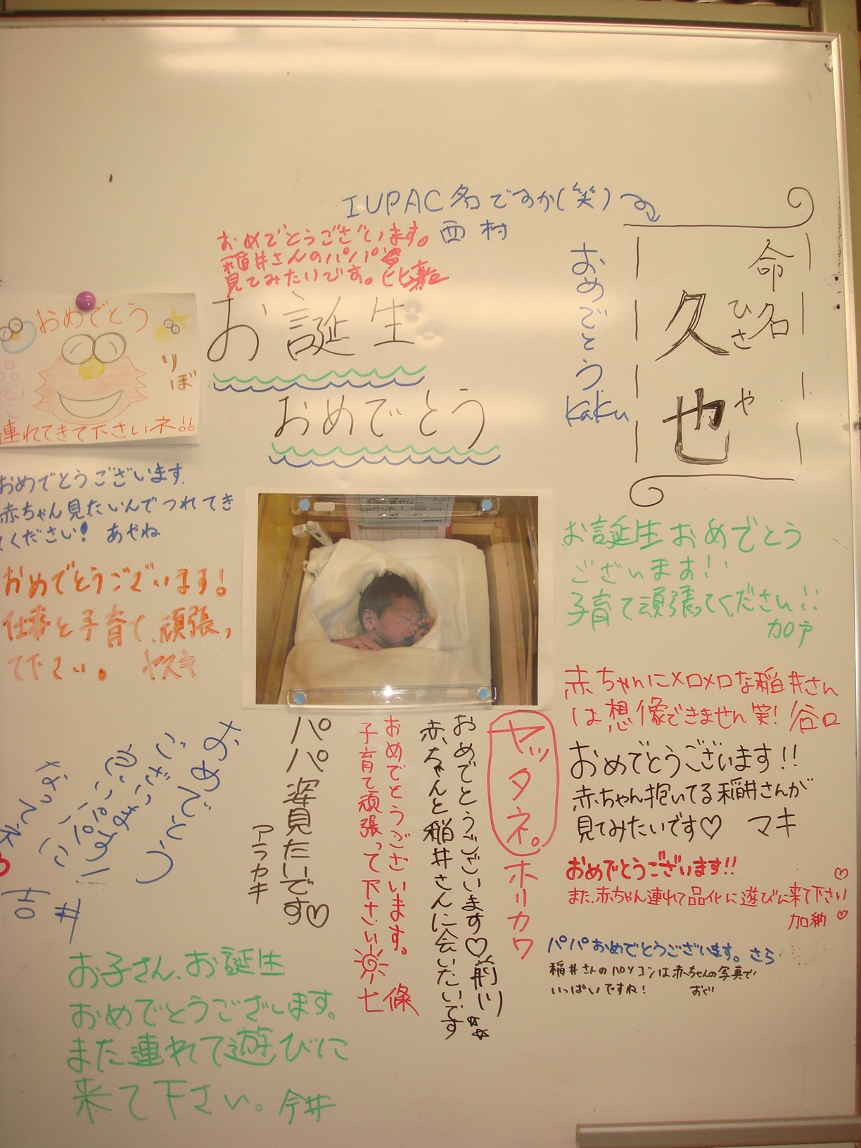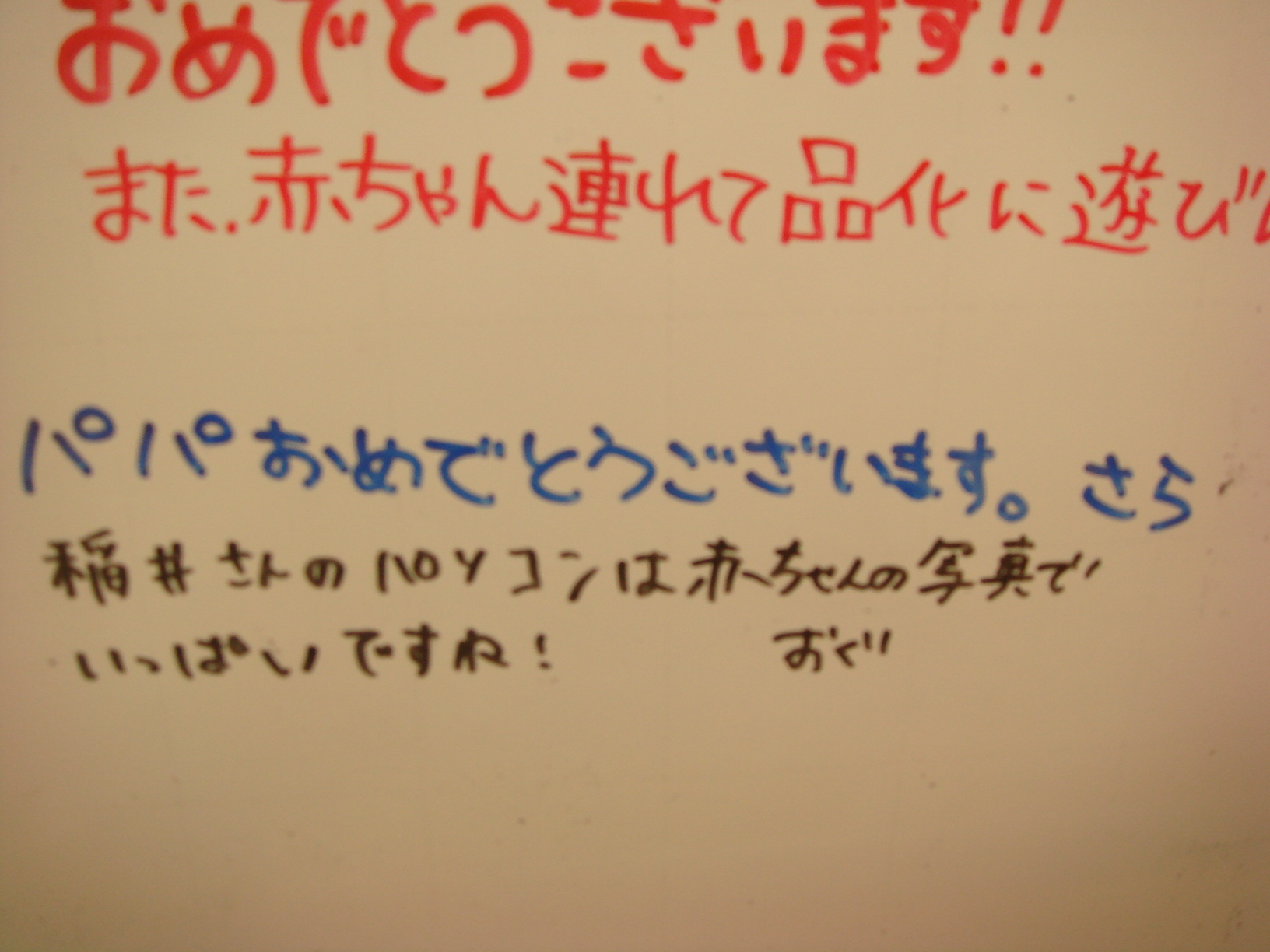 稲井Jr.誕生 遅くなっちゃいましたがなーんと!!稲井さんに第一子が誕生いたしました7月19日に,元気な男の子が産まれたそうです品化一同大喜びです!!!!喜びすぎて,おめでとコメントを皆で寄せ書きしちゃいました稲井さんの弟子のが右下にちっちゃくあったのでアップしました↓本当に,おめでとうございます稲井さんに似るのかなぁ・・・・?カキ PR