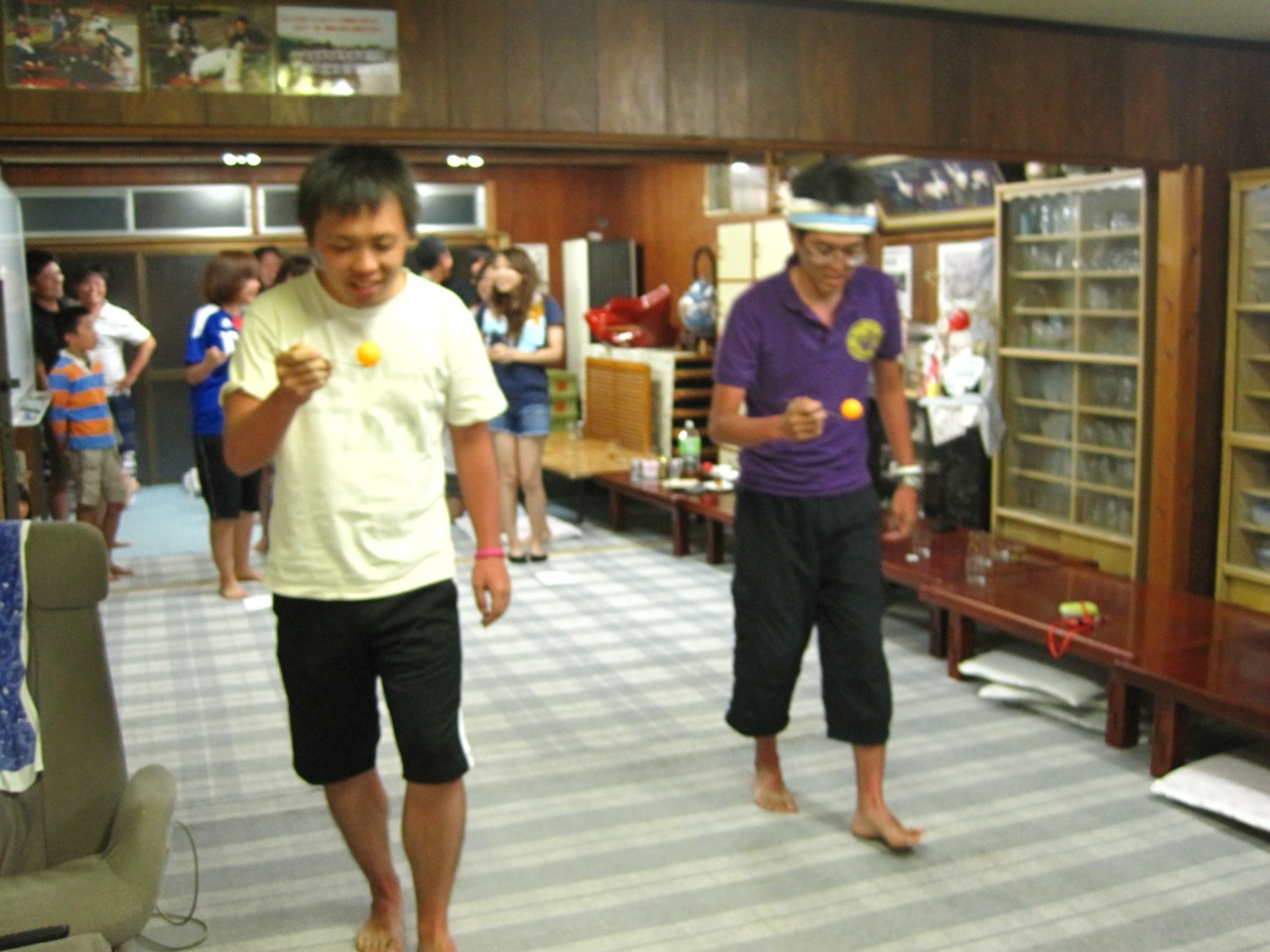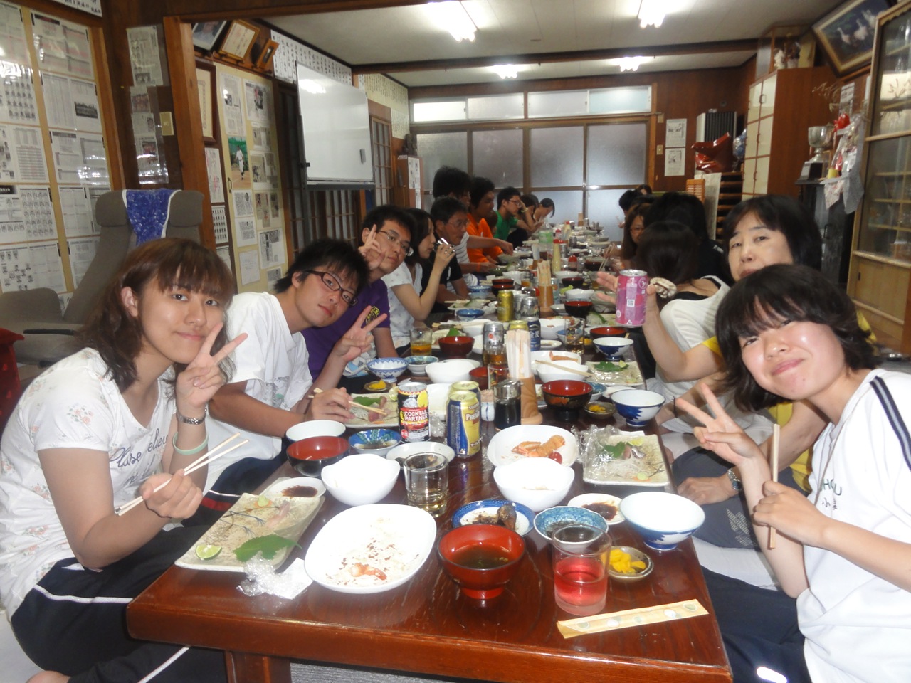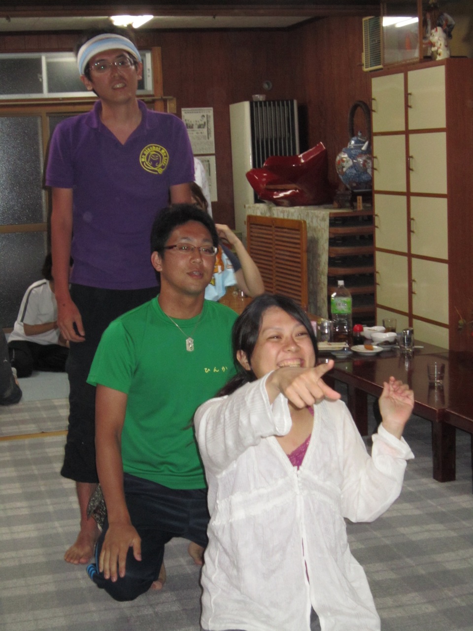 研究室旅行 二日目 夜中まで騒いでいた ○ッキーのおかげで,早く寝たのに,結局寝不足だったKK....しかーし,二日目もエンジン全開です!まずは民宿に荷物を下ろして... そう,この日は 海!!白浜海岸で快晴の中,ボディーボードに波遊び 貝掘り???ちょっと波が高かったので,シュノーケルはできず残念でしたが,海水浴を満喫です.(そう,うちの子もボードにめちゃめちゃハマってました)ポンカン氷も食べましたよ.初めてだった人,お味はどうでしたか? おいしかった?今回は,品化の定宿「民宿吉田」に予約が入っていたので,キャプテン吉井くんが新しい宿を見つけてくれました.その名も『民宿ぬしま』宍喰町にある民宿で品化で貸しきりでした.大変おいしい夕食で,みんなぺろりでした! この日は品化研究室旅行最大のイベントと言っても過言ではない「ゲーム大会」です.ゲーム係がいろいろ考えてくれました.クイズ(?)タイトル分からん スプーン競争(ピンポン球競争) (稲井さん,西村くん 顔,へんですよ)あれは?と思っている卒業生のみなさん.やりましたよもちろん.進化ゲーム!! ゴキブリのみなさんです.この日も,お酒! ジェンガ! お話し! です.
