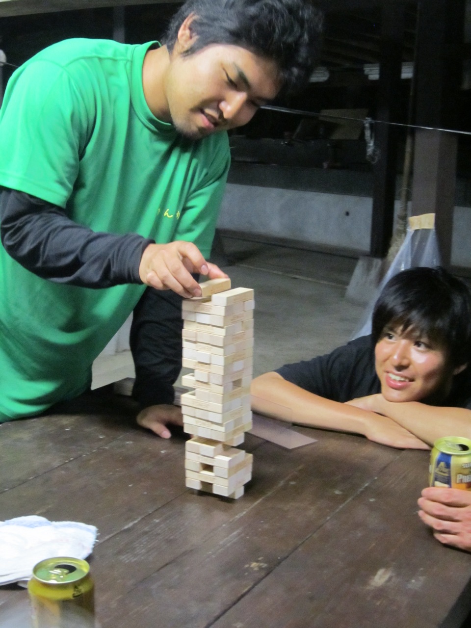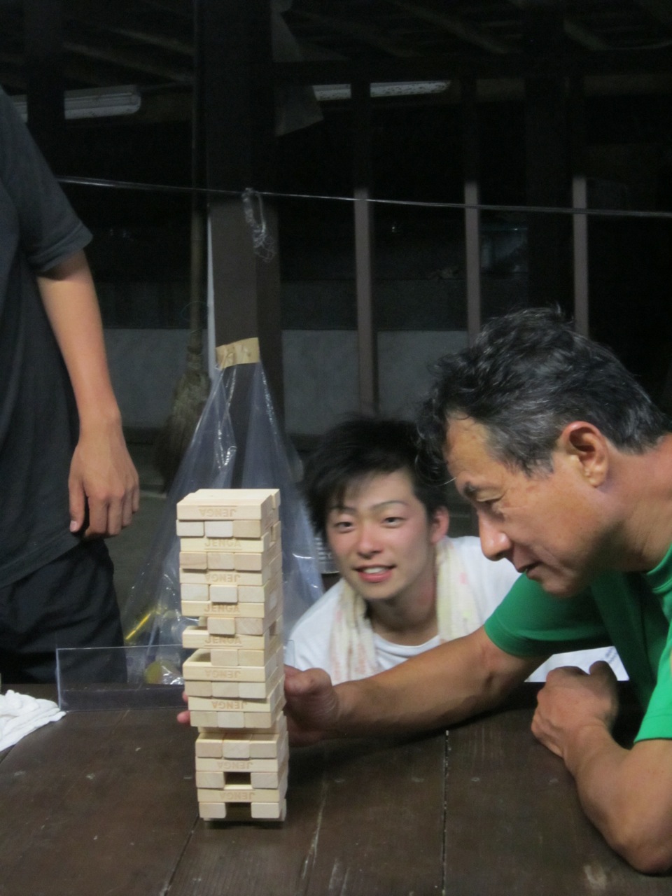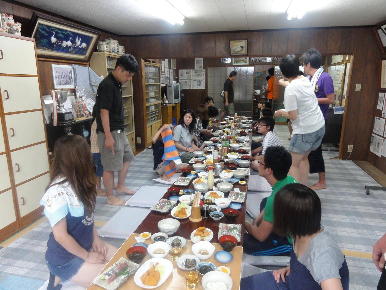 研究室旅行 二日目 夜中まで騒いでいた ○ッキーのおかげで,早く寝たのに,結局寝不足だったKK....しかーし,二日目もエンジン全開です!まずは民宿に荷物を下ろして... そう,この日は 海!!白浜海岸で快晴の中,ボディーボードに波遊び 貝掘り???ちょっと波が高かったので,シュノーケルはできず残念でしたが,海水浴を満喫です.(そう,うちの子もボードにめちゃめちゃハマってました)ポンカン氷も食べましたよ.初めてだった人,お味はどうでしたか? おいしかった?今回は,品化の定宿「民宿吉田」に予約が入っていたので,キャプテン吉井くんが新しい宿を見つけてくれました.その名も『民宿ぬしま』宍喰町にある民宿で品化で貸しきりでした.大変おいしい夕食で,みんなぺろりでした! この日は品化研究室旅行最大のイベントと言っても過言ではない「ゲーム大会」です.ゲーム係がいろいろ考えてくれました.クイズ(?)タイトル分からん スプーン競争(ピンポン球競争) (稲井さん,西村くん 顔,へんですよ)あれは?と思っている卒業生のみなさん.やりましたよもちろん.進化ゲーム!! ゴキブリのみなさんです.この日も,お酒! ジェンガ! お話し! です.