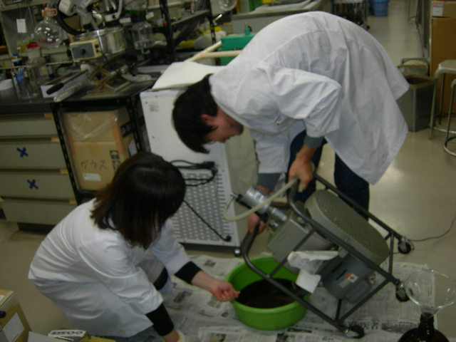 オイル交換 いつもお遊びとかのブログばっかになっちゃうので、ここで実験というか研究室内でのブログをアップしたいと思います私達がいつも使っている真空ポンプ。ポンプの中にはオイルが入っていて、ある程度するとそのオイルを交換します。M1か○だ君がポンプのオイルを逆流させたため、キレイにするがてら、オイル交換も行いました写真で見て分かるように、オイル…真っ黒です笑交換するときのオイルは淡黄色透明の液体なんです…すごい汚れようですねポンプもキレイなオイルに交換してもらってもっと働いてくれるでしょう☆おまけ☆ポンプ交換で疲れた後のひと息みなさん、疲れすぎてません?仲悪いの??笑あら、やっぱり仲良さそうです品化はあまり白衣を着ないので、新鮮な感じでした(この時白衣を着ているのはオイルで服が汚れないためです)また、大掃除の時に汚れたオイルが待っています