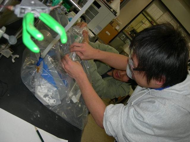 CMMP初体験 「薬品化学教室」といえば何が浮かんでくるでしょう?やはり新光延試薬であるCMMPでしょう写真はCMMPの小分け作業をしているところです.これがまた地味〜な作業なのに非常に気を使う作業でもあります.空気に触れたらもうサヨナラなので写真のようにアルゴンで満たされたゴミ袋のなかで作業してます.当たり前のようにやってますが,この作業をするのは実は二人とも初めてです.この作業で二人の仲の良し悪しが分かっちゃう(笑)ってぐらいスムーズに作業しないと試薬がだんだんダメになってしまいます.少し時間がかかったものの,無事に小分けすることができました.