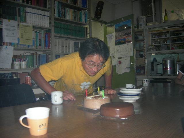 角田先生の誕生日(`09.9.4) ブログ更新がだいぶ滞ってましたので、どどーんとアップします加来さんに引き続き、9月4日は我ら角田先生の誕生日でした今年は例年と違って卒論がないため、ゆっくりすることができました写真はろうそくの火を消す角田先生ですみんなで、おいしく2ホールのケーキをいただきましたしばらく誕生日の人がいないので、ケーキを食べるのも今度はいつになるやら…(笑)