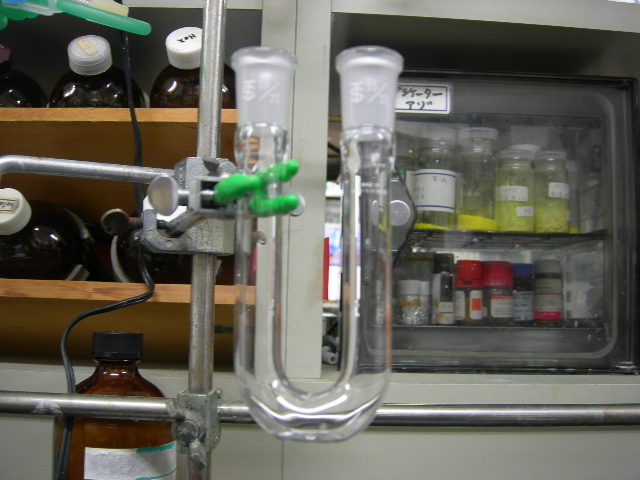 たまには... 最近,遊んだ話ばっかりだったので,たまには研究室の中を...(笑)マスター小村さんことこむーちょは,液膜移送を行っています移送を行う道具で,今まではU字管やH字管を使っていました.これがU字管これがH字管しかし,これらでは,撹拌があまりよろしくないのではないかと...そこで,彼(?)はやってきましたででーーーーーーーん足付きナスフラスコーーーーーースターラーバーも4つ回ってます新しい器具,見た事ない器具はおもしろいですねこの足付きナスフラスコでいい結果が出ることを期待しつつ,実験に励む毎日ですいっちー
