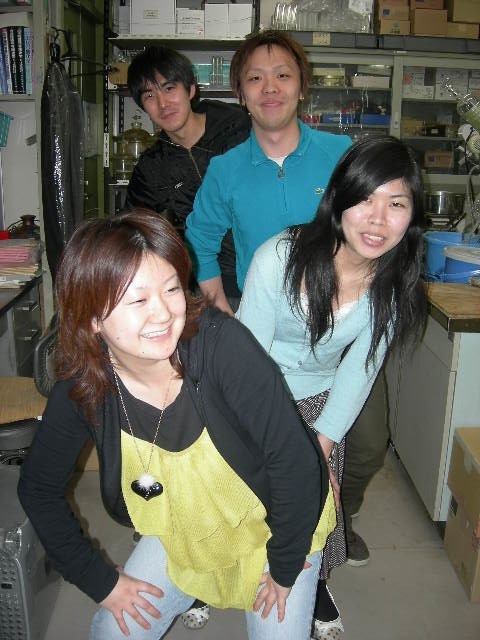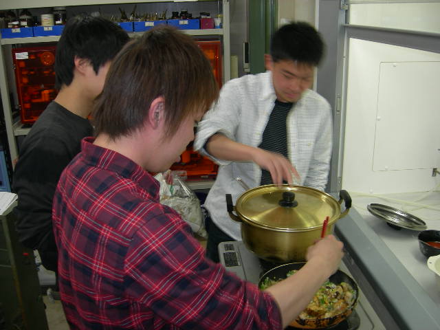 新4年生配属! 4月9日に新しく新4年生が7人、品化にやってきました!!男の子2人、女の子5人と女の子が多いです。そして9日に歓迎会を行いました!料理のメニューはいつもより豪華(by加来さん)だったみたいです。☆メニュー☆とりチリ、刺身、トマト&オニオンサラダ、きのこたっぷり炊き込みご飯大根とイカの煮物、キャベツと鶏肉のスープキャベツと豚肉のゴマだれ和え、いわしの梅肉和えキャベツはなんと角田先生宅から取れたキャベツをいただきました!私達が一生懸命作った料理は新4年生に好評でした今回、とりチリは男の手料理っていうことで、M1男2人だけで作っていました。写真はM1の2人と加来先生です。普段料理をしない2人ですが、とりチリの出来栄えは素晴らしかったです新4年生が入ってきたので、品化もにぎやかになりました!これからもがんばっていきましょうお遊び担当いっちー
