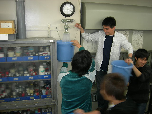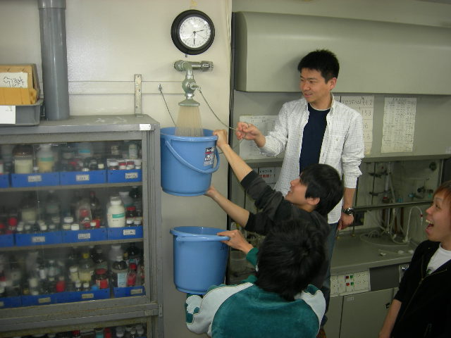 安全対策セミナー('09.4.18) 毎年薬品化学研究室では新しく入ってきた研究生のため、または今までいた研究生のために 2日間をかけて、研究室で安全に研究をするために安全対策セミナーを行ってきました。 今年も17,18日の2日間、安全対策セミナーを行いました。 セミナーでは、事故の例や、対処法など、研究をするにあたって大事なことを話しました。 その後、廊下にある消火栓や消火器、シャワーの位置を確認しました。 そして・・・ 研究室の中にあるシャワーの水を出してみました! 去年も出してみたのですが、長年出してなかったため、茶色い水が出てきました(笑) 今年は去年出したばっかりだし、きれいな水が出るだろうと思ってました・・・が!! やはり今年も茶色い水が出てきました(笑) この写真と比べてもらうと上の写真の茶色さが分かると思います それはさておき…(笑) このセミナーを生かして、安全できれいな研究室生活を送っていきたいと思います。